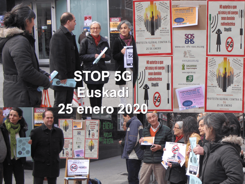 El sábado 25 de enero, se llevó a cabo una Jornada mundial de protesta contra el despliegue del sistema 5G de comunicaciones inalámbricas (se pueden ver noticias de algunos de estos actos en nuestro Facebook). En Euskadi, participamos en esta jornada de protesta las asociaciones SOS EHS-EASC, Eman Eskua, SFC-SQM Euskadi-AESEC, y Sagarrak – Ekologistak Martxan. Como parte de una convocatoria conjunta con la PECCEM y Ecologistas en Acción, realizamos una concentración con carteles en Basauri, Bizkaia, solicitamos firmas de apoyo al Llamamiento internacional para detener la implantación de la red 5G en la Tierra y en el espacio (Ver PDF en castellano) y distribuimos un folleto, cuya redacción agradecemos a la plataforma Stop 5G - Canarias, sobre los riesgos de esta escalada de tecnologías nocivas.